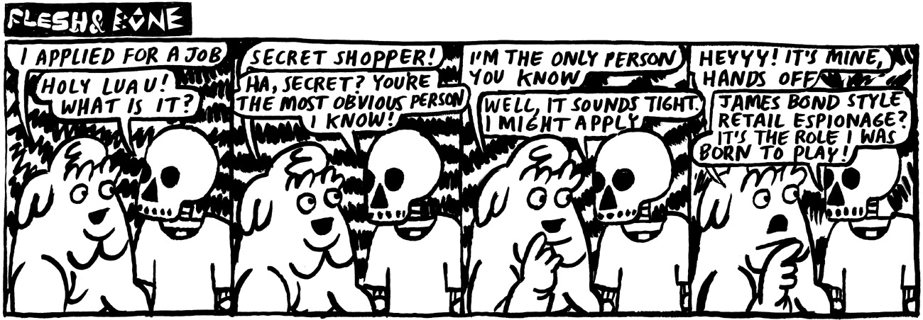 New Flesh & Bone comic strips drop every Monday and Thursday. The Flesh & Bone franchise has been in full effect since May 2008-ish. visit me at www.davidbaileyillustration.com or email me on davidmountpleasant at googlemail dot com